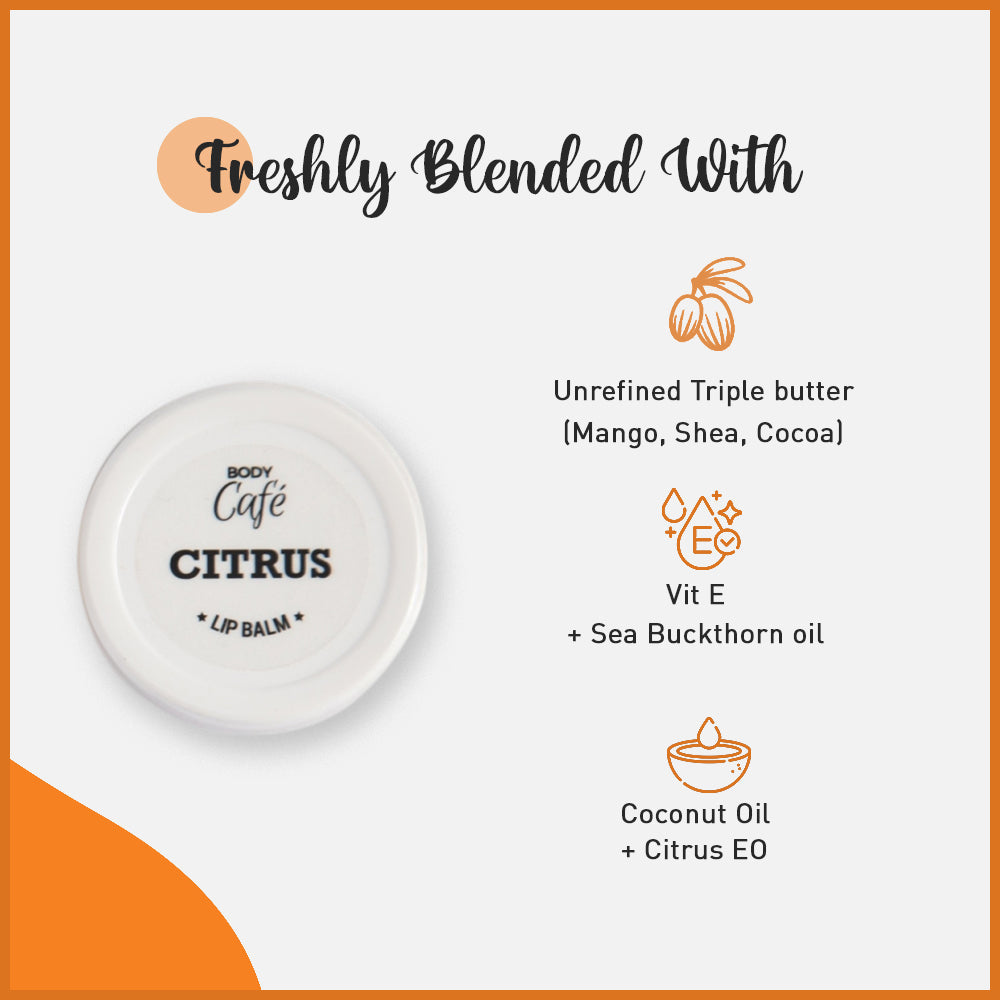 The rich combination of Unrefined Triple butter (Mango, Shea, Cocoa), Vitamin E, Sea Buckthorn oil, Cold-pressed Coconut Oil, Almond oil, Extra virgin Olive oil, Jojoba oil & Citrus EO gives your lips tender love and care. Mixed Citrus Fruit essential oil is rich with vitamin C and instantly brings back life to dull lips. Our lip balms curated by experts also give your lips protection from UV rays. A safe option for you, these lip balms have no added colors or mica and come in a cute packaging to carry with you all day long.