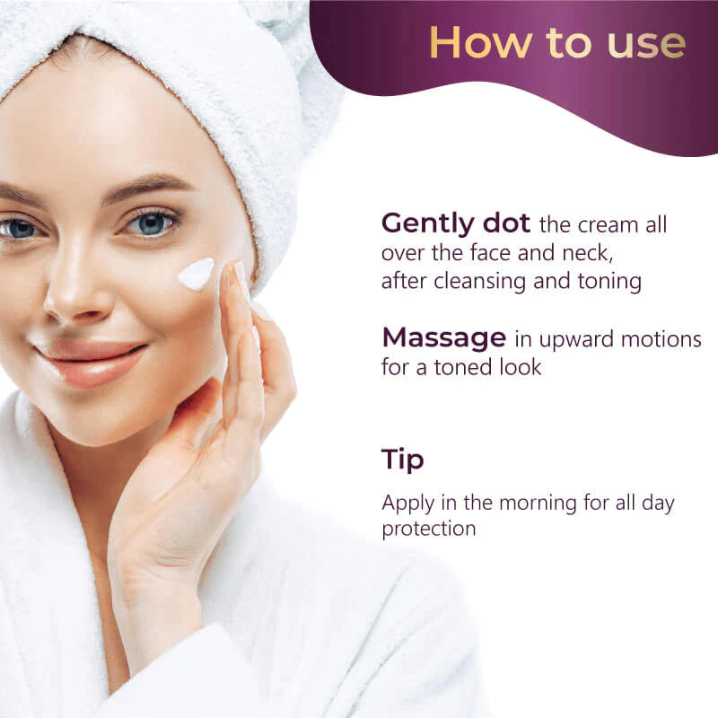 After cleansing and toning, gently dot the cream all over the face and neck. Massage in upward-outward motions for a toned look.